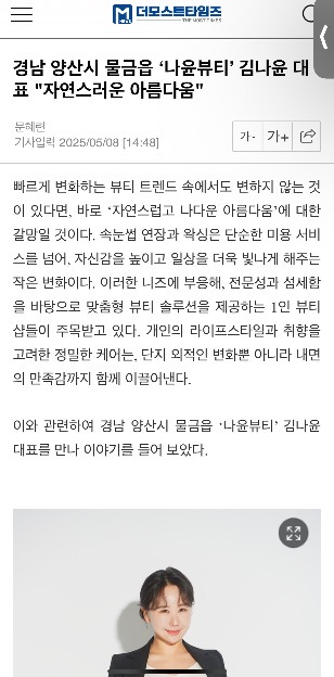 | 양산 물금 속눈썹연장 나윤뷰티에서 예민한 눈을 위한 안구건조증 케어까지 한 번에! (1) | 2025.05.02 |