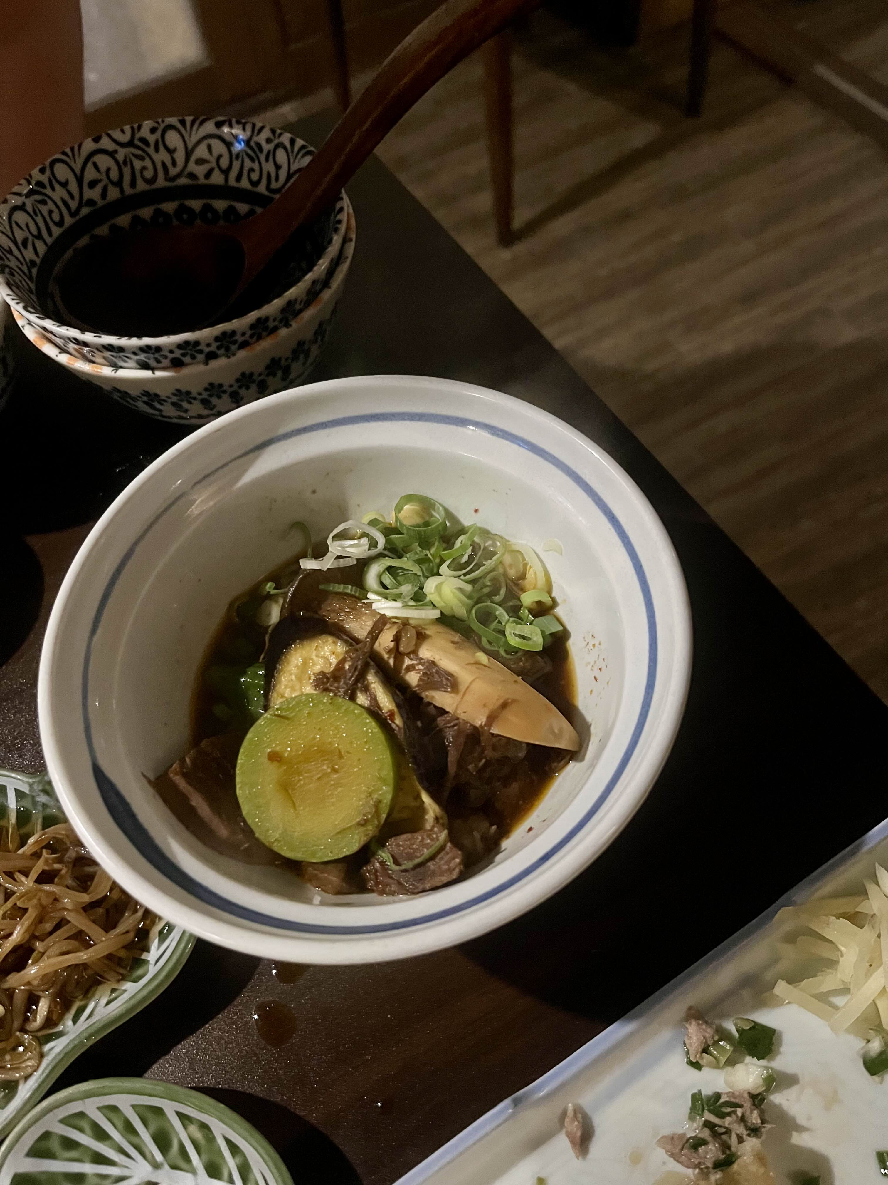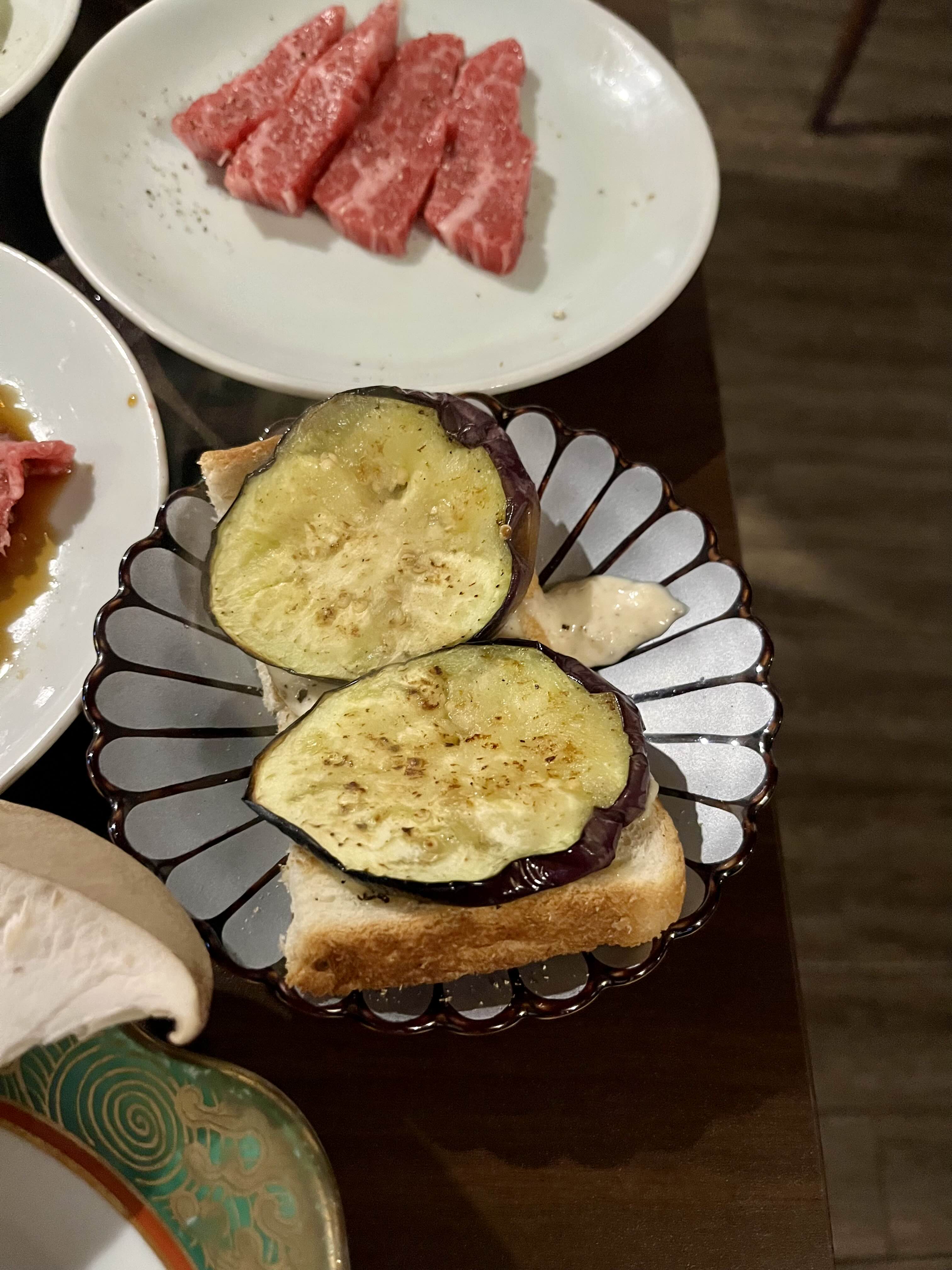고기와 구운 가지를 얹어서 먹으면